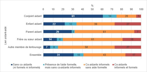 Graphique - Présence de co-aidants formels et informels parmi les proches aidants, selon le lien aidant–aidé :