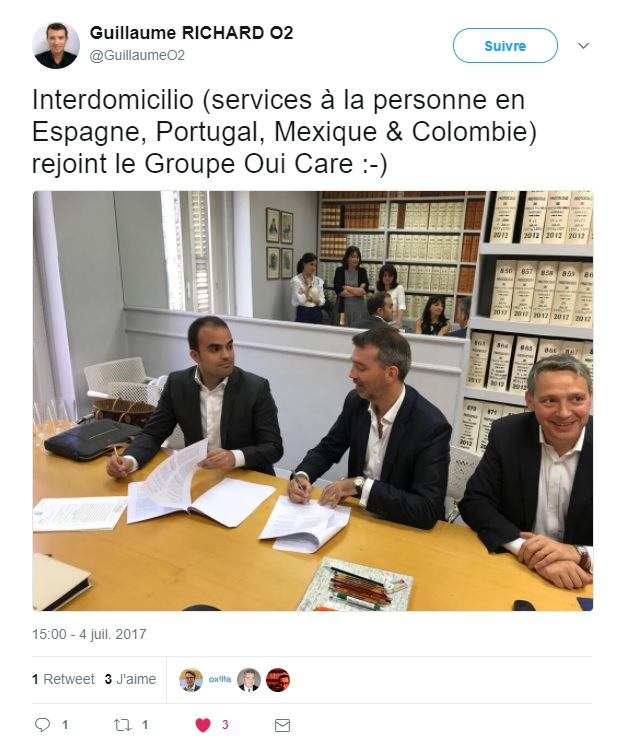 Aujourd'hui, sur son compte Twitter, Guillaume Richard annonce avoir fait l'acquisition d'Interdomicilio, acteur des services à la personne en Espagne, au Portugal, au Mexique et en Colombie.