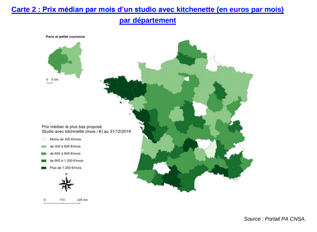 Les studios avec cuisine isolée (F1 bis), en résidence autonomie les moins chers (moins de 600 euros par mois) sont dans l’Aude, en Ardèche, en Dordogne et en Gironde, en Saône-et-Loire, et dans une majeure partie des départements du nord et de l’est de la France.