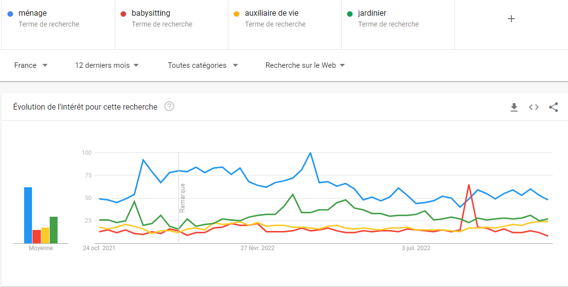 Voici par exemple la comparaison des mots clés "ménage", "babysitting", "auxiliaire de vie" et "jardinier" sur Google Trends :